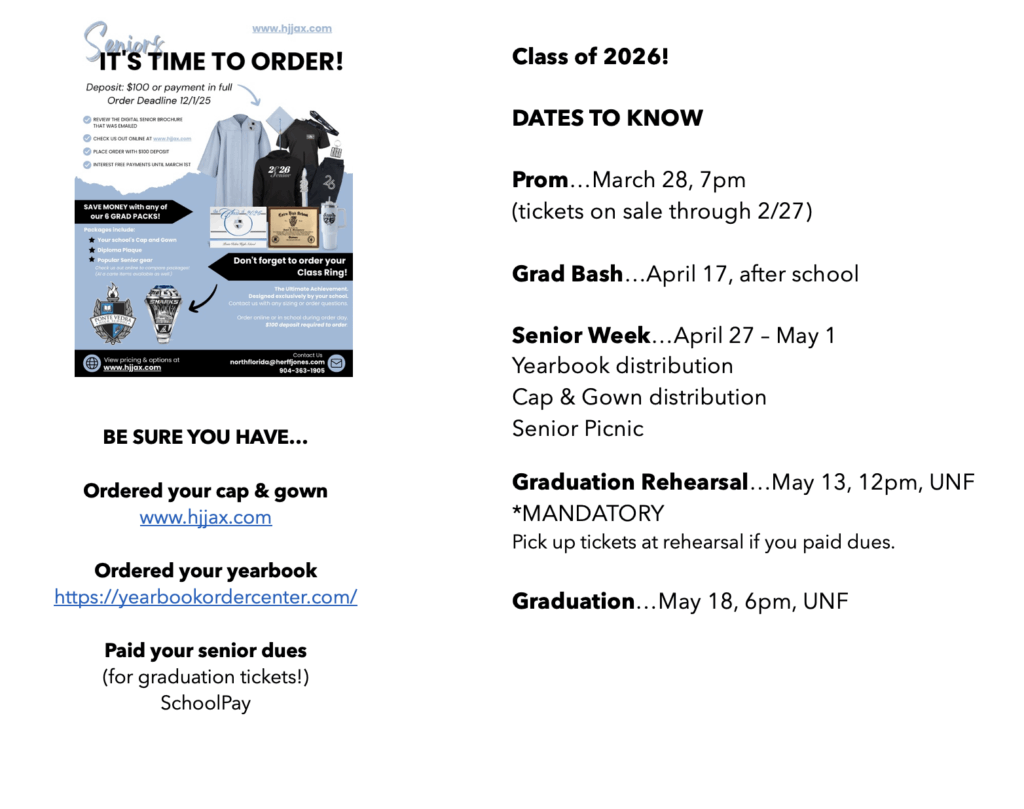 The Universal Studios GRAD BASH senior trip will take place on April 17, 2026.