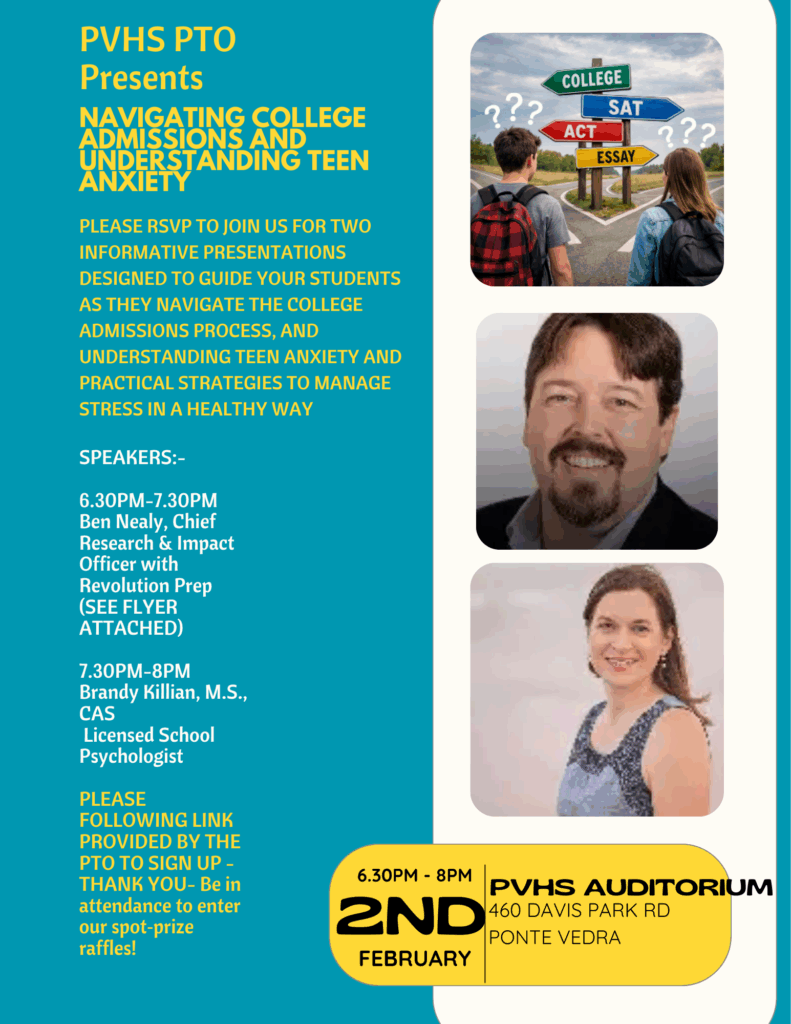 Mark your calendars! Please join the PTO General Meeting on February 2nd at 6.30pm in the Auditorium We have two incredible speakers for our Shark families! ACT/SAT College testing, applications/admissions and teen anxiety/stress will be covered all in one night. Be in attendance to enter our spot‑prize raffles! You don’t want to miss this informative program brought to you by your PTO!