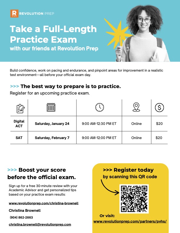 Our practice exams with Revolution Prep are quickly approaching! If your student hasn’t registered yet, this is a great opportunity to get real test-day practice and an instant, detailed score report. Every family also receives a complimentary 30-minute score review to help map out the best testing strategy.